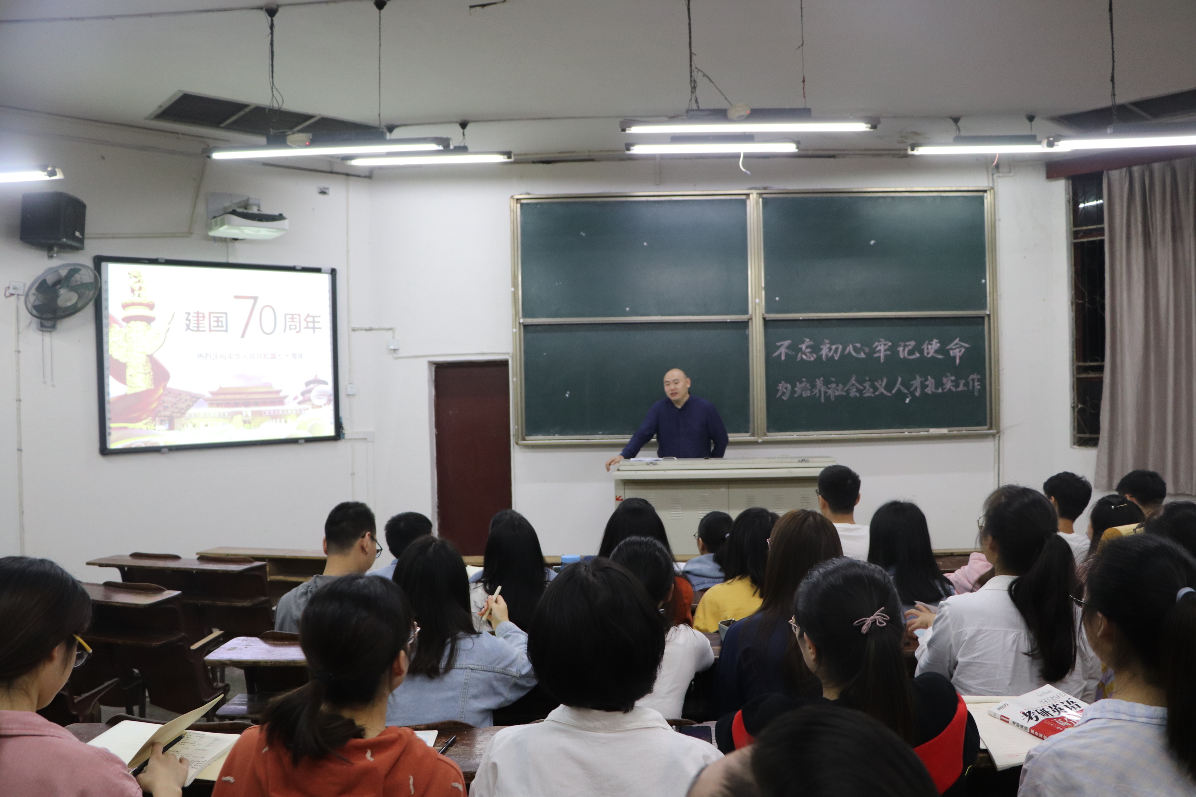 屈川书记从新中国成立70周年切入主题,首先回顾了“两弹一星、港澳回归”等历史事件,展望70年来新中国华章巨变的奋斗历程及成就。70年弹指一挥间,中国已经迈步跟上时代步伐。随后,引出了社会主义新时代的一系列问题,举出中国5G技术引领时代的实例,高度赞誉了现代中国的在走向高质量发展之路上取得的成就。并用视频观看的形式,高度赞扬了现今中国具有的民族自信和实力自信,实现新时代的中国梦,青少年是主力军。屈川老师在课程结束时对在座党员提出殷切期望,希望他们不忘初心,牢记使命,为党和国家奉献自己的力量,竭尽全力履行好自己应有的义务。