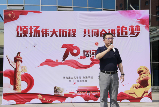 党总支书记刘春辉讲话。刘书记说到,中华人民共和国成立以来,70年风雨征程,中国共产党带领全国各族人民团结一致,砥砺奋进,实现了中国历史上一个又一个的“不可能”,创造了一个又一个的人间奇迹,实现了从贫穷走向富裕,正在从富裕走向强盛。这充分说明,我们的党,我们的祖国,我们的人民是伟大的。我们每个人都要由衷的热爱党,热爱祖国,热爱人民。身为马克思主义&政法学院的学子,我们要始终保持很强的政治意识,扎实学习习近平新时代中国特色社会主义思想,站稳政治立场,提高政治站位,增强政治担当。他强调,爱党爱国爱人民,绝不是空洞抽象的,而是具体的,要内化于心,外化于行。青年大学生只有自觉将个人理想融于民族复兴梦想,将个人的幸福融入人民的幸福,努力贡献出自己的青春、智慧和力量,才能与祖国共奋进、与时代同发展,才能最终让梦想变成现实,才能书写人生的壮丽华章!