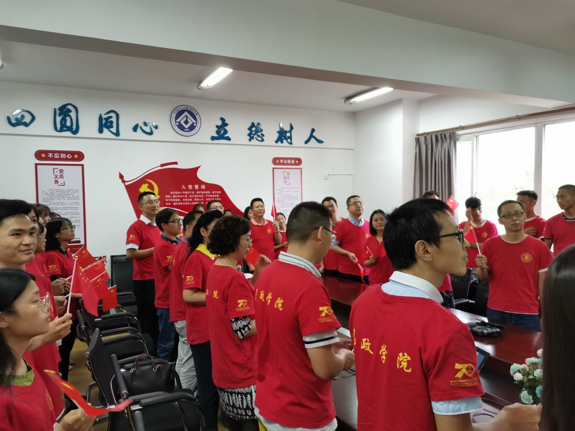 10月8日下午,在举国欢庆中华人民共和国成立70周年之际,结合学校“不忘初心、牢记使命”主题教育,马克思主义学院、政法学院组织全体教师和部分学生开展“我向祖国表白”主题党日活动。