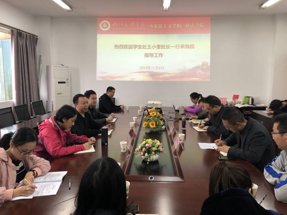 11月4日下午,学校学生处处长王小奎、副处长冉林、副处长黄文曦一行来我院调研工作,学院党总支书记刘春辉主持会议,党总支副书记吴辉兵、专兼职辅导员参加会议。