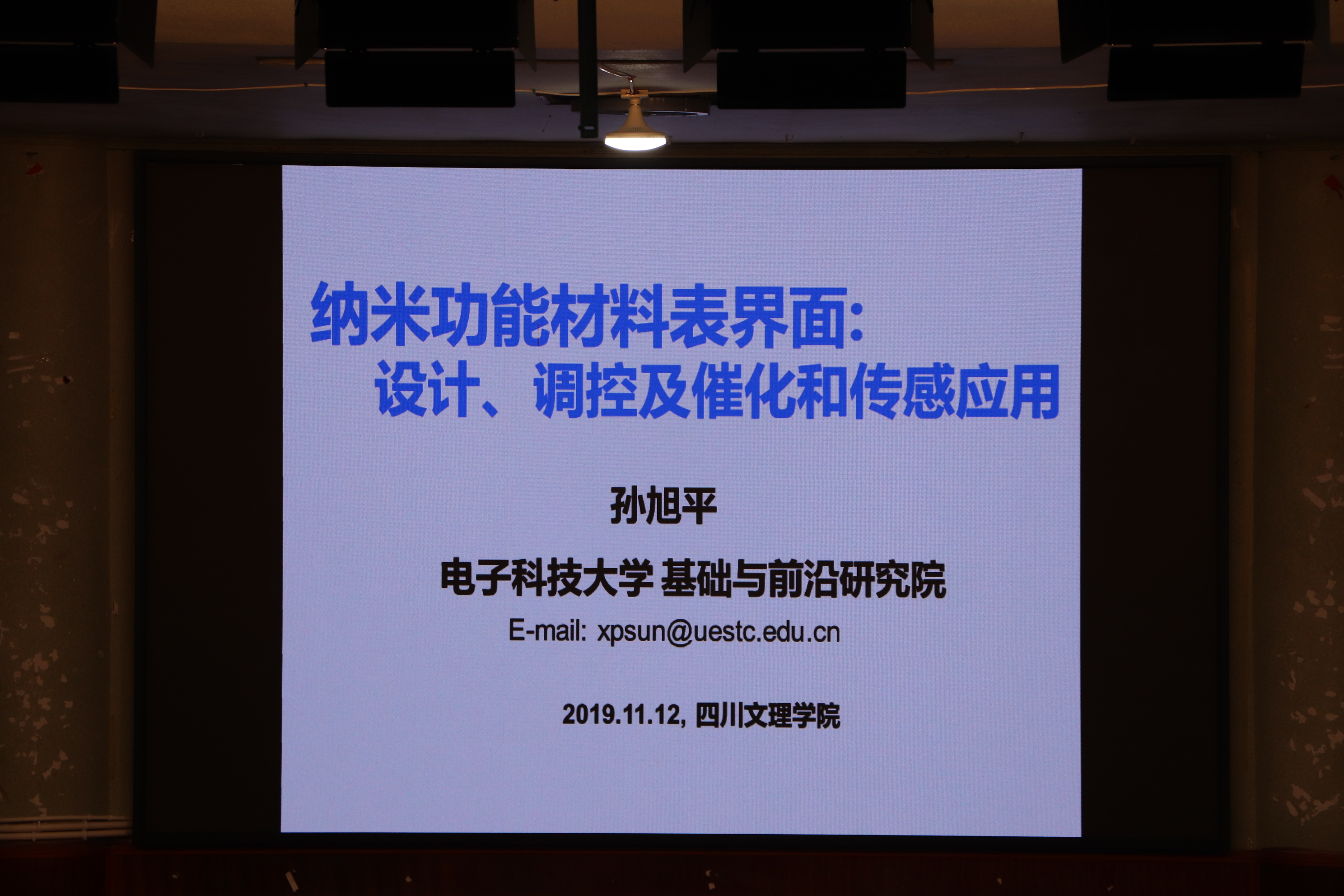 应四川文理学院化学化工学院邀请,电子科技大学基础与前沿研究院孙旭平教授于2019年11月12日到访化学化工学院并进行学术交流。晚上19:00孙旭平教授在南坝校区学术报告厅做了“纳米功能材料表界面:设计、调控及催化和传感应用”的专题报告。化学化工学院党总支书记朱朝菊,副院长邓祥及化学化工学院300余名师生代表聆听报告会。报告会由化学化工学院院长刘长路主持。