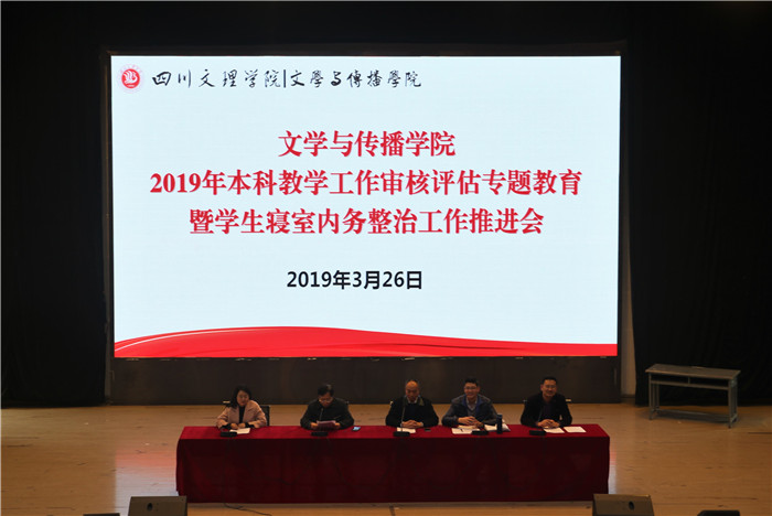 3月26日下午1点,文学与传播学院本科教学工作审核评估专题教育暨学生寝室内务整治工作推进会在艺术传媒大楼多功能厅召开。文传学院党总支书记赵定贵、院长杜松柏、党总支副书记兼副院长张桢老师、团总支副书记、学工办副主任宋涛老师、辅导员孙琪老师出席会议。文传学院团总支学生会副部长及以上学生干部、修业班各班班长、团支书、学习委员、劳生委员、纪检委员和综治委员等参加会议。会议由文传学院党总支副书记、副院长张桢老师主持。
